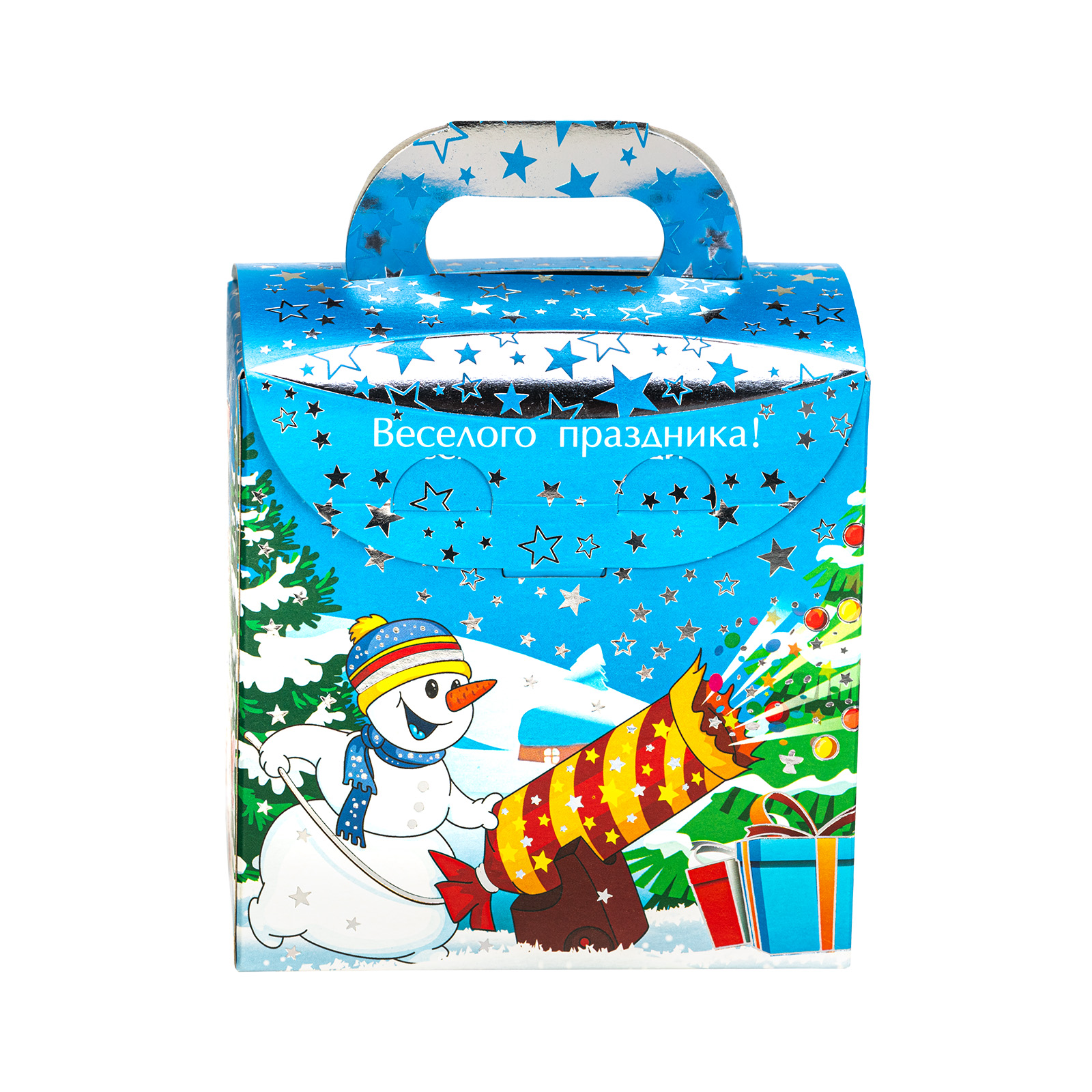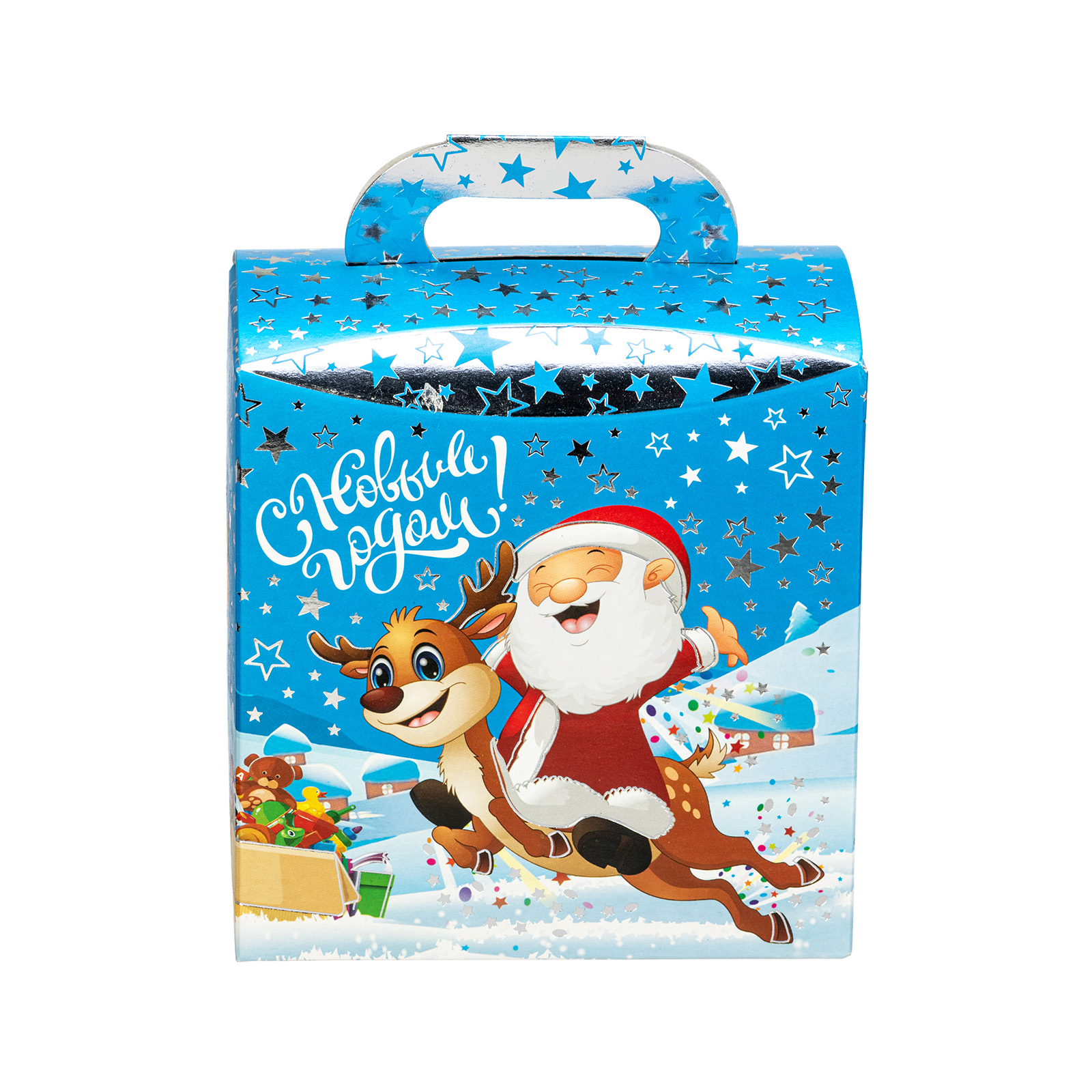 Формула идеального новогоднего сладкого подарка предельно проста: привлекательная яркая упаковка + вкусные сладости внутри. Именно такими характеристиками и обладает данный подарочный набор. Это небольшая картонная коробка с забавной новогодней иллюстрацией, на которой Дедушка Мороз и его верный товарищ олень весело мчатся по заснеженной долине мимо ее обитателей. На упаковке есть поздравительная надпись, сверху находится удобная ручка, но самое главное спрятано внутри этой маленькой коробочки! Там находится 400 грамм отборных сладостей от ведущих кондитерских компаний и небольшой памятный сувенир!