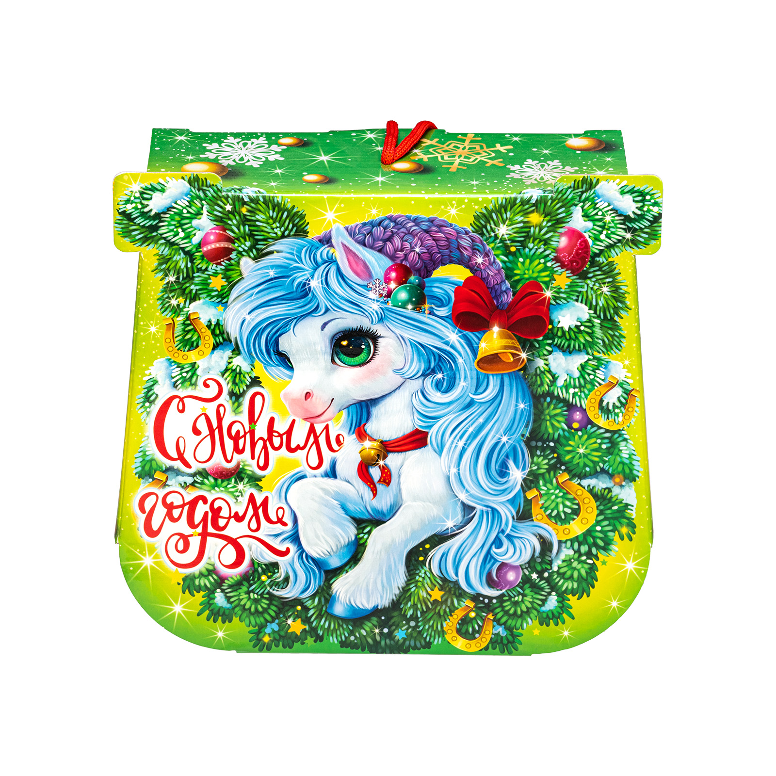 С древних времен подкова считается символом удачи, а также надежным оберегом от всех бед! Так что если хотите сделать кого-то счастливым, то подарите ему этот подарочный набор. Небольшая картонная коробочка с удобной ручкой легко вместила в себя россыпь вкусных и разнообразных сладостей, которые скрасят любой новогодний стол. Помимо сладкого наполнения в состав этой волшебной подковы входит небольшой памятный сувенир, который поможет надолго закрепить приятные воспоминания об этих замечательных новогодних праздниках!