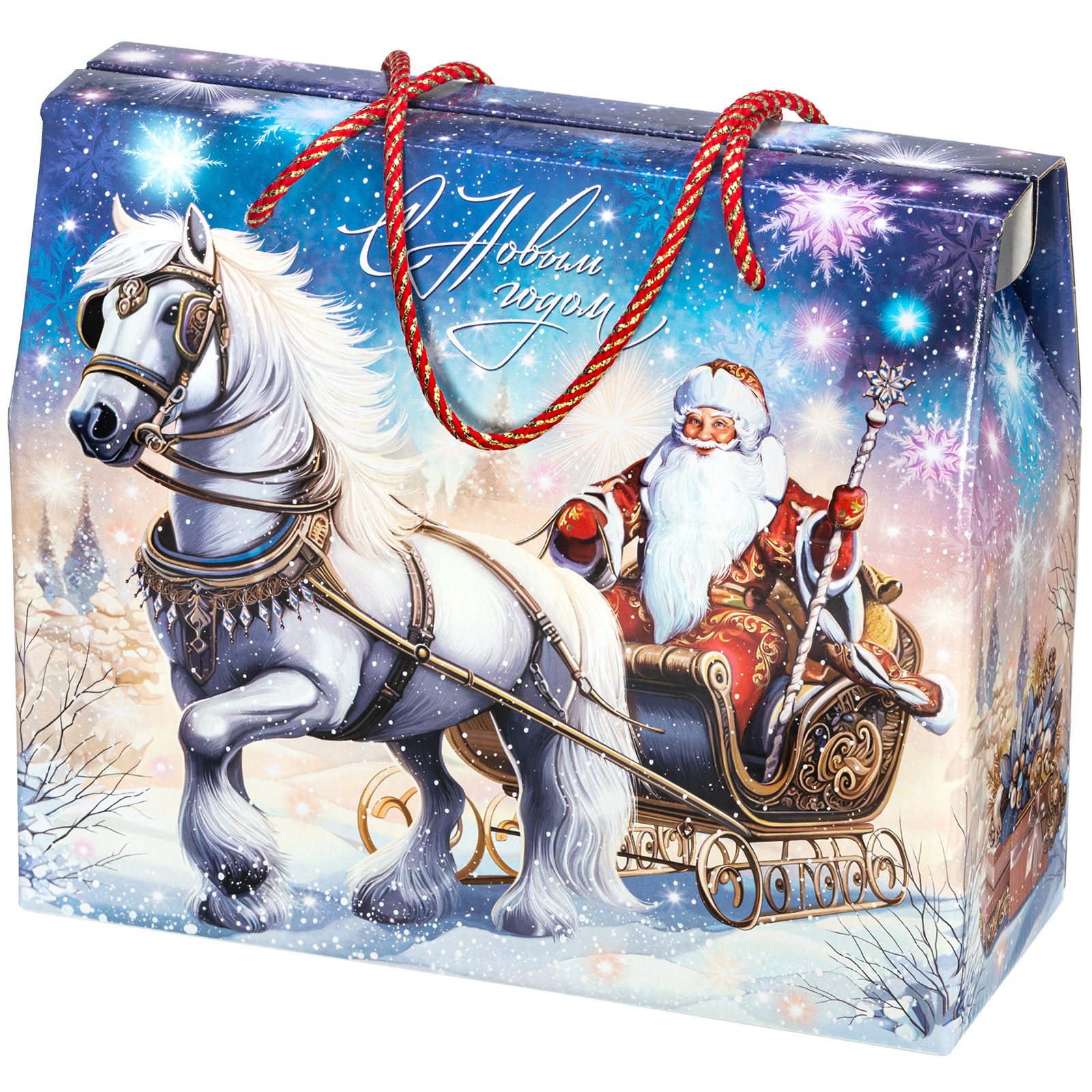 Новогодний сладкий подарок должен обладать не только замечательным вкусом сладостей, но и иметь яркую оригинальную упаковку, которую так и не терпится раскрыть! “Сумочка визит” - компактная картонная коробочка с удобной ручкой-шнурком красного цвета. Наличие ручки делает набор крайне удобным для транспортировки, что позволяет взять такой подарок в дорогу, чтобы вручить другу или родственнику из другого города. На сумочке изображен Дедушка Мороз в упряжке, а внутри этого подарка бережно хранятся отборные сладости, которые идеально подойдут к любому праздничному столу.