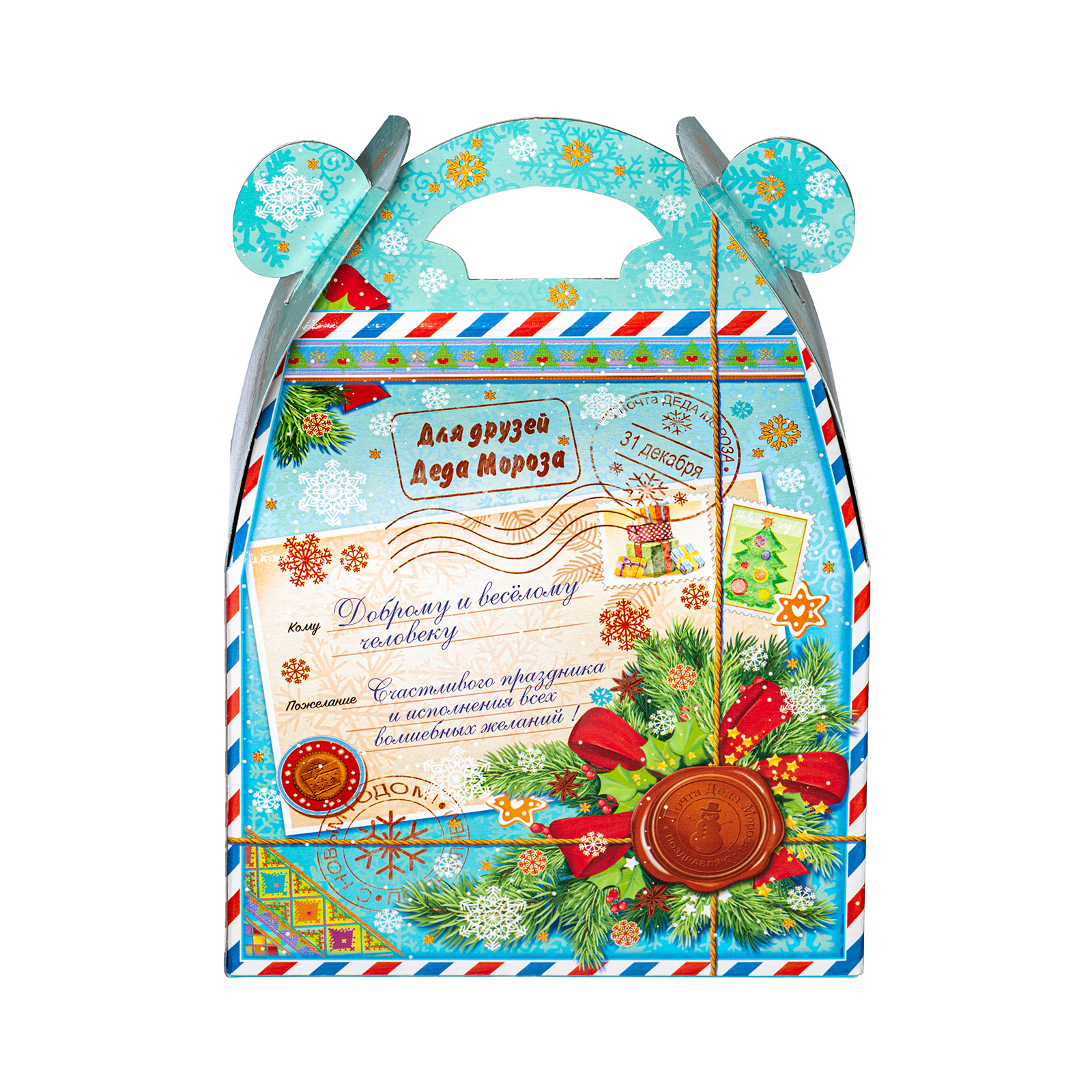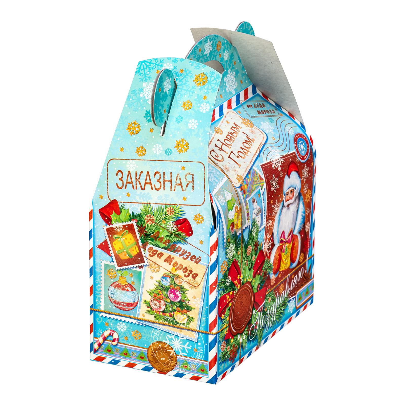 Новогодние сладкие подарки в картонной упаковке актуальны и по сей день. Набор “Сундучок открытки” - это универсальный выбор, который прекрасно подойдет как для ребенка, так и для совершенно взрослого сластены. Подарочная упаковка прекрасно сочетает в себе яркие праздничные иллюстрации и приятный нежно-голубой фон. Внутри набора хранятся 500 грамм самых разнообразных сладостей от ведущих кондитерских предприятий и небольшой памятный сувенир, который надолго сохранит в себе волшебную атмосферу новогодних праздников.
